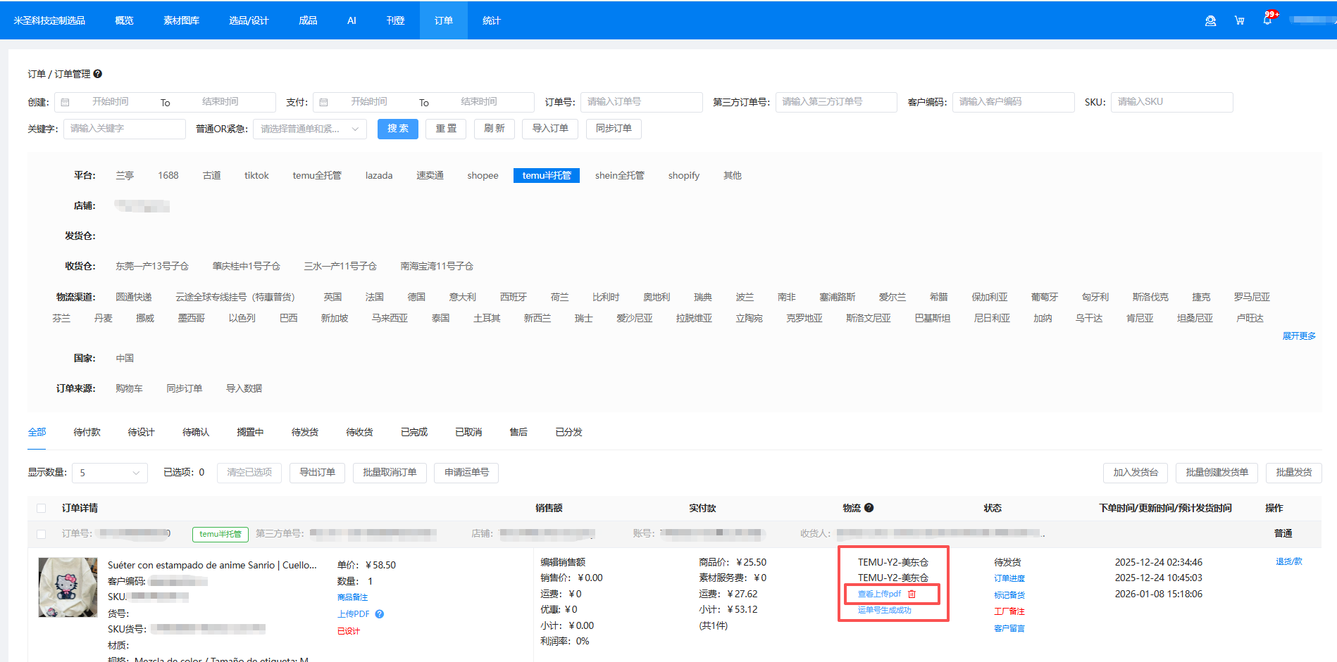 審核通過后,在訂單列表的【物流】列,可以找到頭程面單。