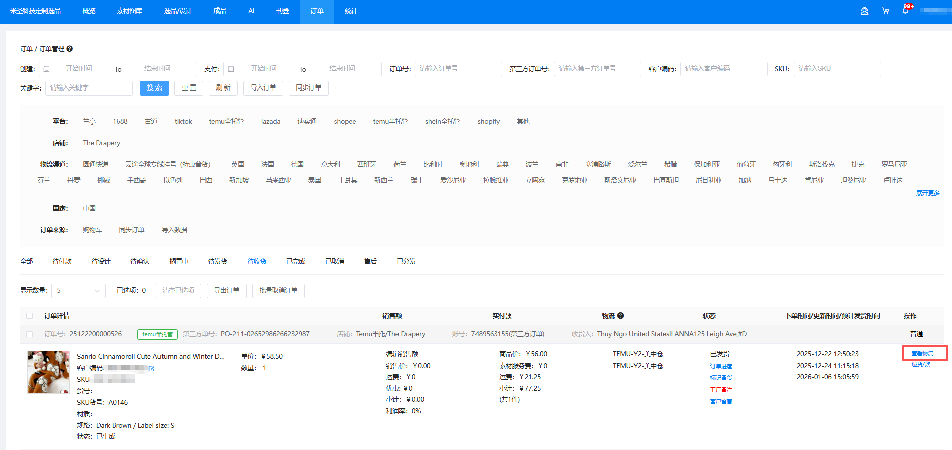 您可以在該訂單的右側(cè)操作欄,點擊【查看物流】,實時跟蹤訂單的運輸軌跡。